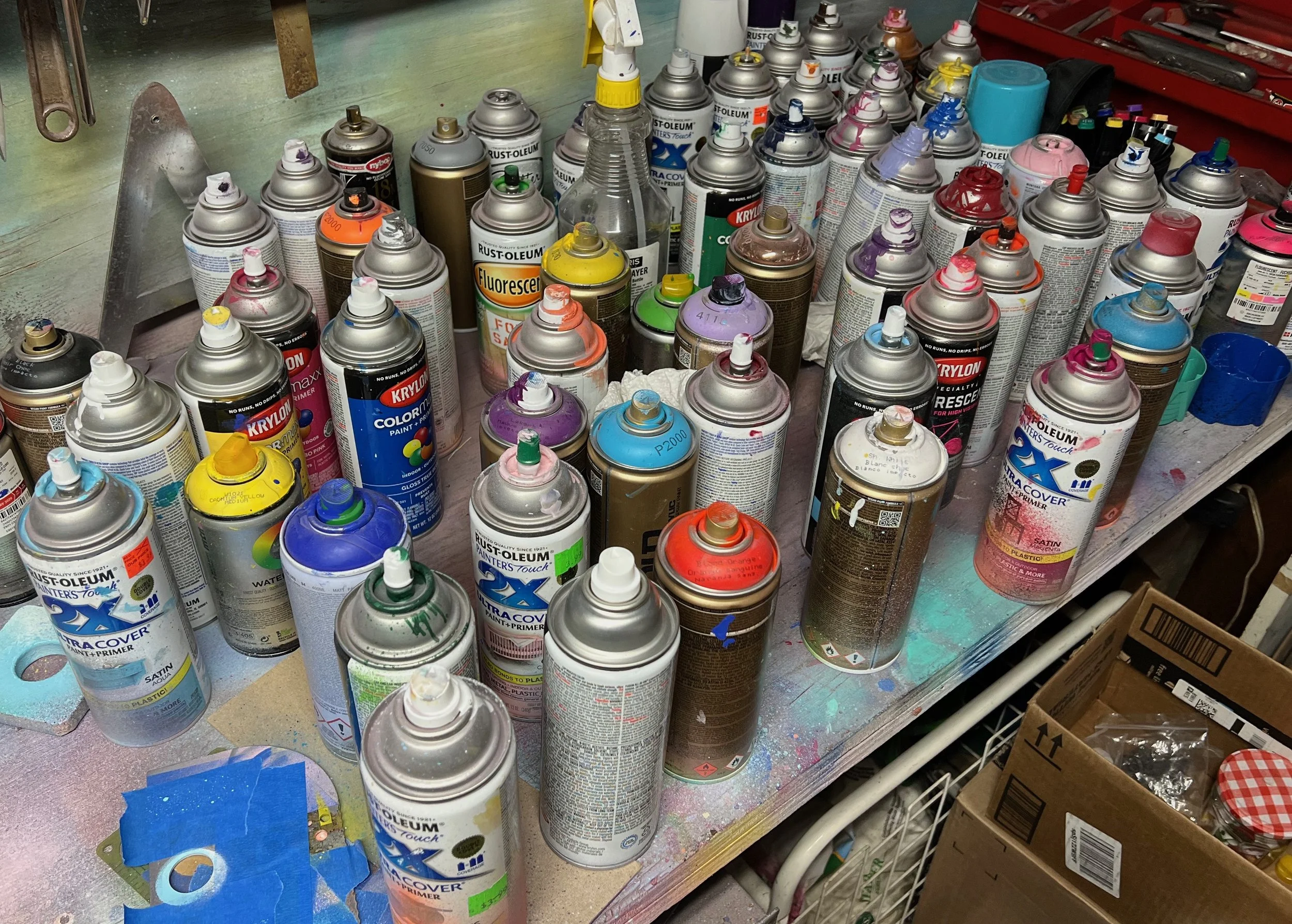 I use mostly spray paint I buy at the hardware store, though I’m gradually adding “professional” spray paint I get at the art supply store.