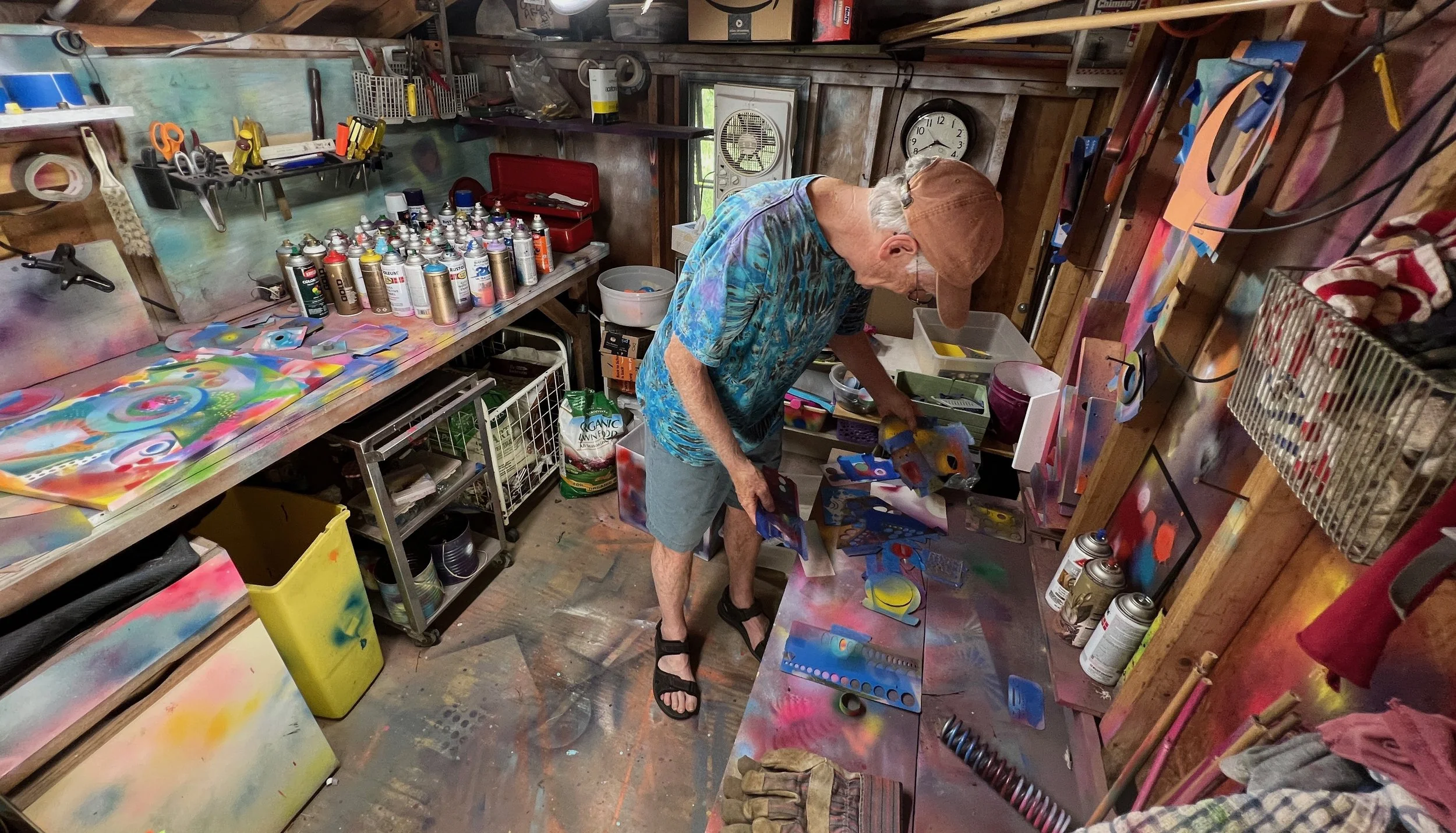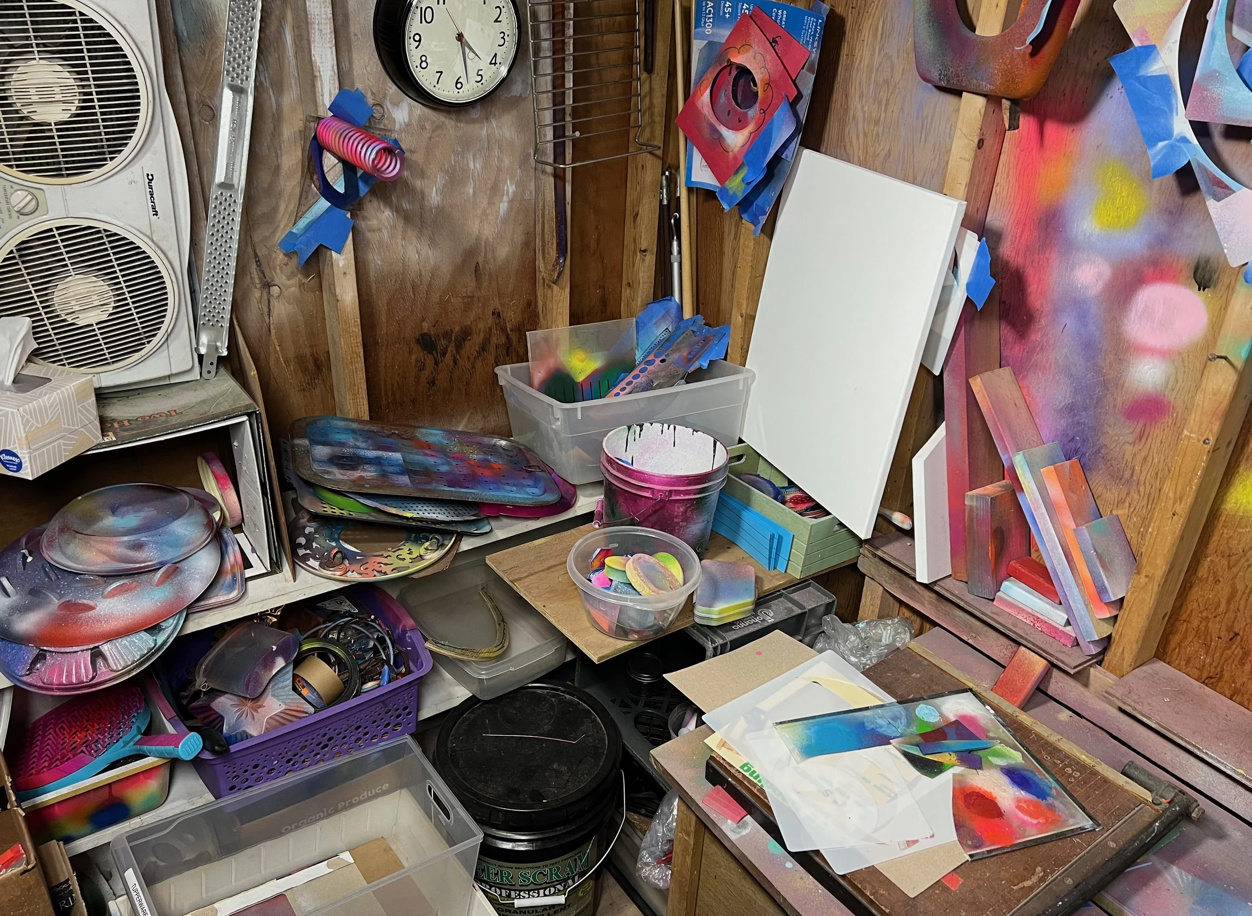 I discovered spray paint art gradually. It evolved beginning with my spraying all my garden tools orange and yellow and red so I could find them when misplaced in the garden beds. Then, just for fun, I painted all the plastic buckets I use for hauling stuff as I garden. I painted the tools and buckets directly on the floor of my shed andI became fascinated with the abstract and colorful patterns left behind. I started painting anything I could find and experimented with making ever more interesting compositions and colorful patterns on the shed floor. But the problem with floor art is it doesn’t last because it gets walked on and scuffed. The solution was to buy a few canvases at the art supply store and capture the silhouettes of the tools and other found objects so I could preserve them and even hang up on my wall. I’ve been experimenting ever since, with an attitude of ‘anything goes’ and ‘I wonder what happens if I do this.’ Since I started with a crude form of stenciling from painting tools, I’ve continued to push the limits of stenciling and masking for my ‘serious’ art.